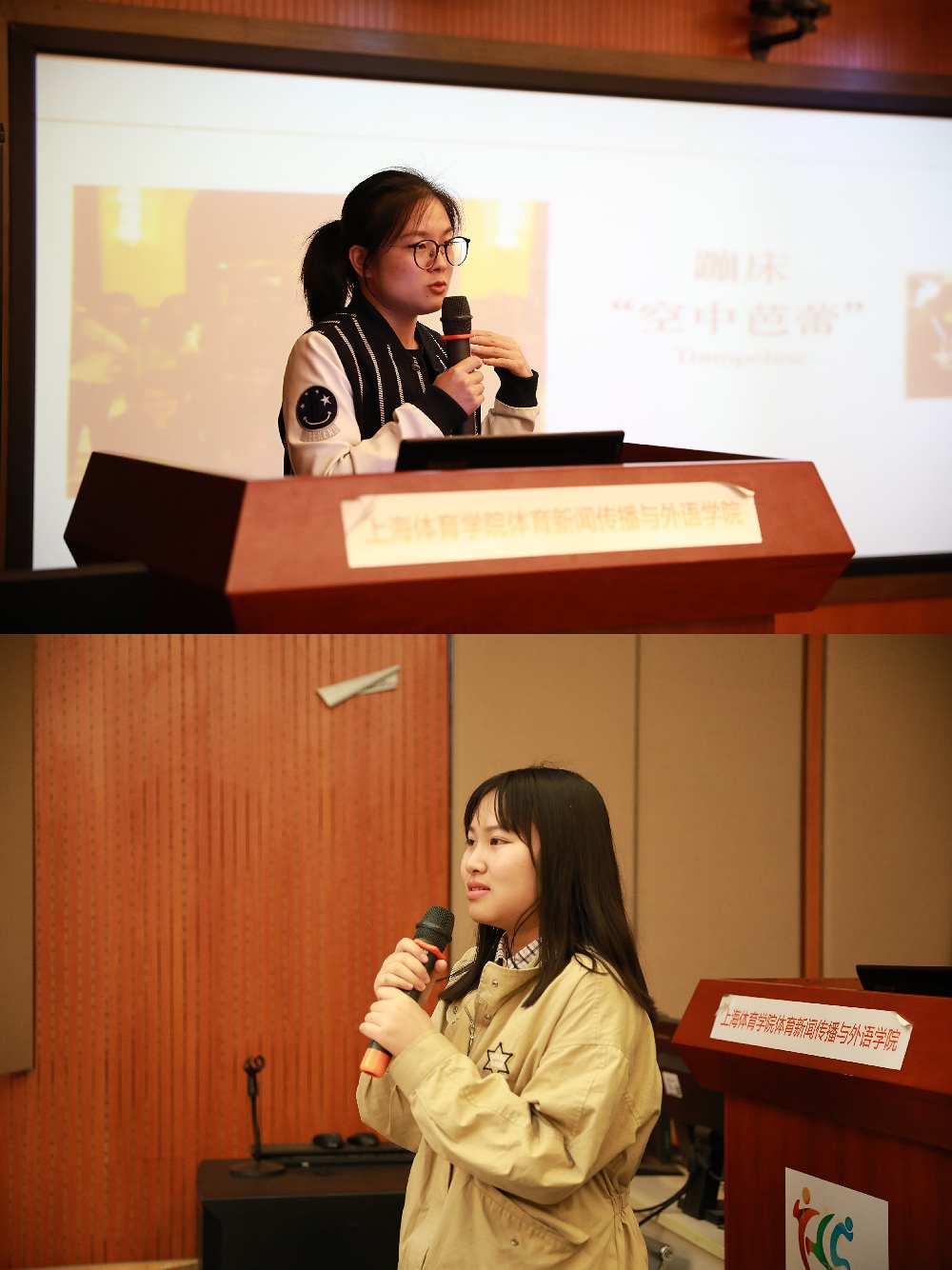 13级英语系学生党员,原新外学院第七届团总支副书记洪金涛进行了分享。她曾是2016年国际体操联合会蹦床世界杯的语言服务志愿者。三年前的这次志愿经历在她看来是一次十分宝贵的经历,是她第一次一对一的从事外国体育代表队对接工作,近距离感受体育的魅力。在此之前,她几乎不了解蹦床这个体育项目,为了做好志愿服务,她自己做了很多的功课,努力学习蹦床的专业术语,以便更好的与代表队交流。每天的工作十分繁重,协调队伍的饮食起居、训练比赛安排等,最终凭借绿瓦人对体育的执着与奉献精神,出色的完成了志愿服务任务。洪金涛提到提供语言服务是一件很快乐的事情,体育学院英语专业的学生相比于其他高校同专业学生最大的优势就是了解体育项目,如果能把第二外语也学好的话,那就更能发挥自己的作用了,洪金涛目前在体训学院读体育教育专业的硕士,她也表述目前体育行业、体育产业蓬勃发展,外语+体育的模式一定前途光明大有可为,她也鼓励英语系的学弟学妹们考取体育专业的硕士研究生,成为更好的体育人。