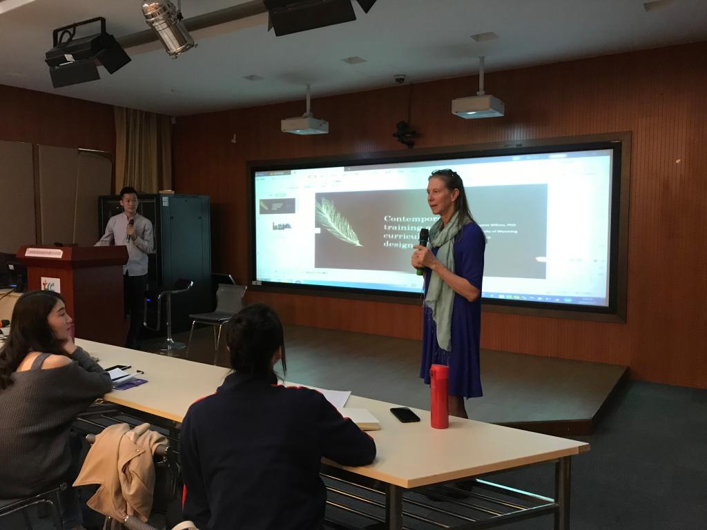 Margaret Wilson教授在怀俄明大学戏剧舞蹈系讲授现代舞、垂直舞蹈、舞蹈生物力学等已有多年,她注重从全球化视角看待舞蹈,重视舞蹈与体育,舞蹈与科学的融合。授课第一日,Margaret Wilson教授的讲座主题为《美国大学舞蹈专业课程设置及人才培养模式》,讲座以美国部分高校为例,对美国舞蹈项目的运行机制、学科建设、课程设置、人材培养,师资要求等进行了介绍,尤其是美国大学舞蹈课程的设置多元化、师资队伍的多能化和人材培养方式的灵活化,对当前我校舞蹈编导专业教学计划的修订具有重要的启示作用。