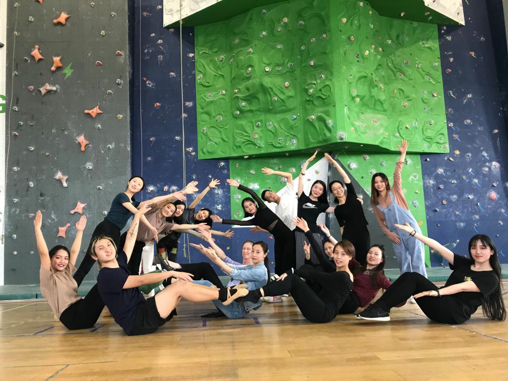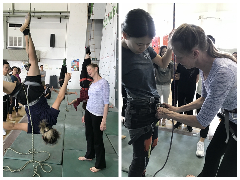 第四日Margaret Wilson教授带领舞编师生进行了“垂直舞蹈”工作坊体验,“垂直舞蹈”是利用先进的登山设备,舞者从屋顶或者岩壁垂直面滑下凌空而舞,用优美的肢体语言来演绎舞蹈。垂直舞蹈以“空中无极限”的理念,来阐述舞蹈与自然、与城市的关系,重新定义了舞蹈的发展空间。“垂直舞蹈”在怀俄明大学具有多年的教学和表演优势,也是全美唯一一所开设垂直舞蹈项目的学校。Margaret Wilson教授在垂直舞蹈编舞方面卓有成就,我校舞编师生在“垂直舞蹈”现场体验中表现出极高的热情。
