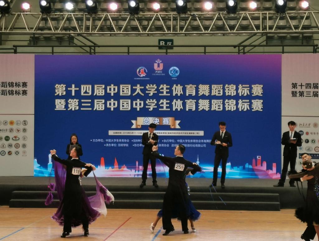 本网讯 5月11至12日,第十四届中国大学生体育舞蹈锦标赛暨第三届中国中学生体育舞蹈锦标赛(总决赛)在昆明学院体育馆隆重举行。本项比赛是中国大学生体育舞蹈领域最高级别赛事,学校高度重视,由传媒与艺术学院院长杜友君担任领队,体育舞蹈院队主教练陈世瑶、教练冯娜一同为我校派出的14名参赛选手现场指导 。在选手的共同努力下,我校取得5金、5银、2铜的优异成绩。