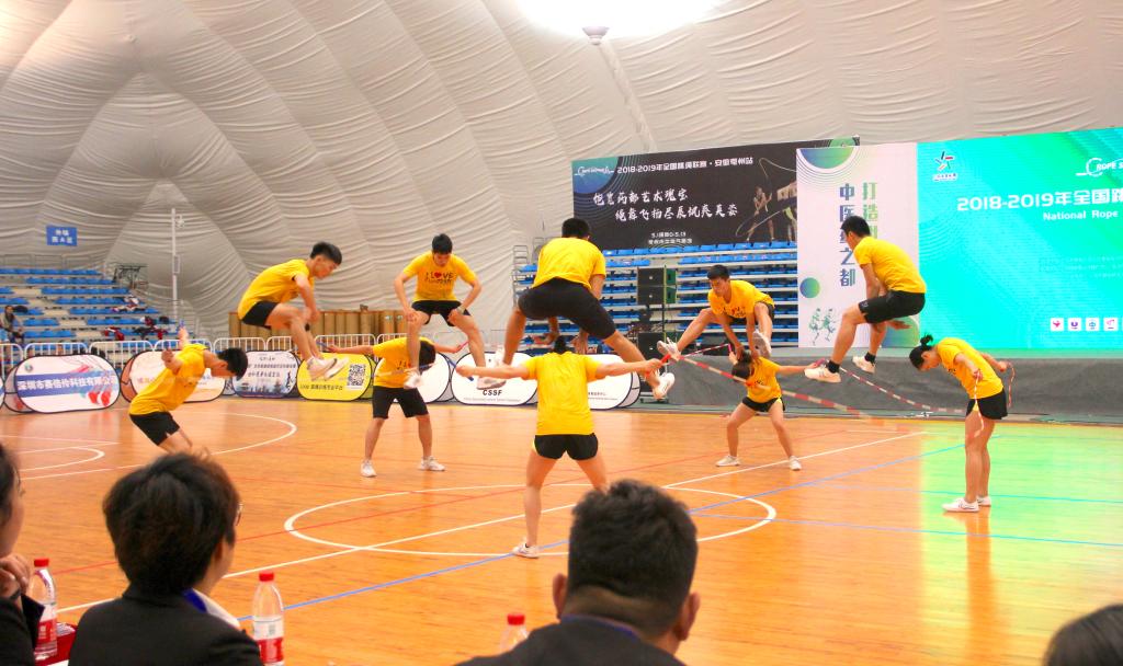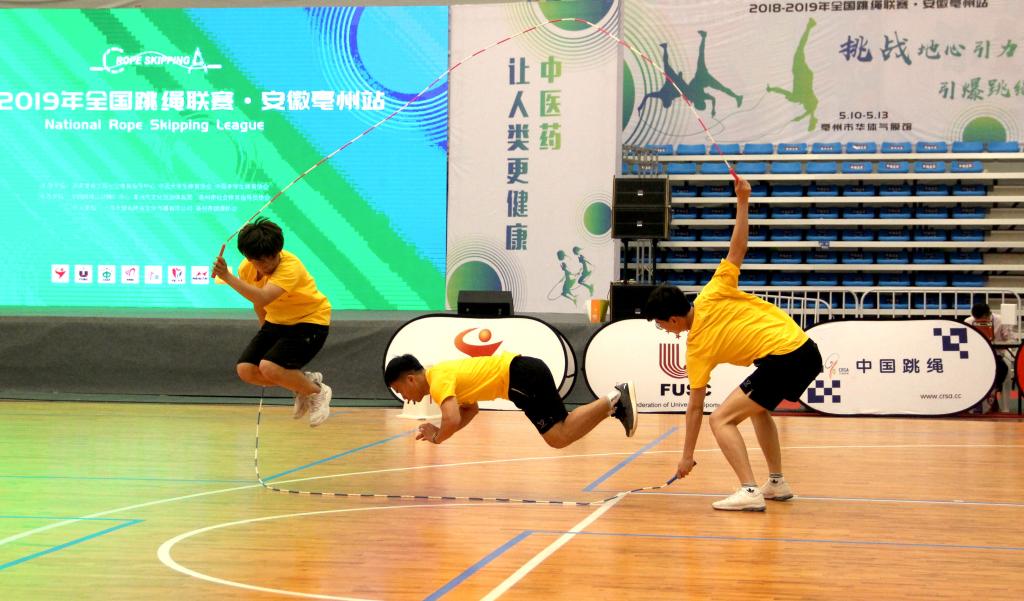 本网讯 2019年5月10日至13日,由国家体育总局社会体育指导中心、中国大学生体育协会、中国中学生体育协会主办的2018-2019年全国跳绳联赛(亳州站)在安徽亳州华体气膜馆隆重举行,共有来自北京、上海、安徽、福建、广东、河北、河南、江苏、江西、山东、山西、浙江、陕西、西藏等14个省、市、自治区的60支队伍800多名运动员参赛。我校花样跳绳队以休闲学院副院长刘树军为领队,韩耀刚为教练,19名运动员经过奋力拼搏,取得10金的优异成绩。
