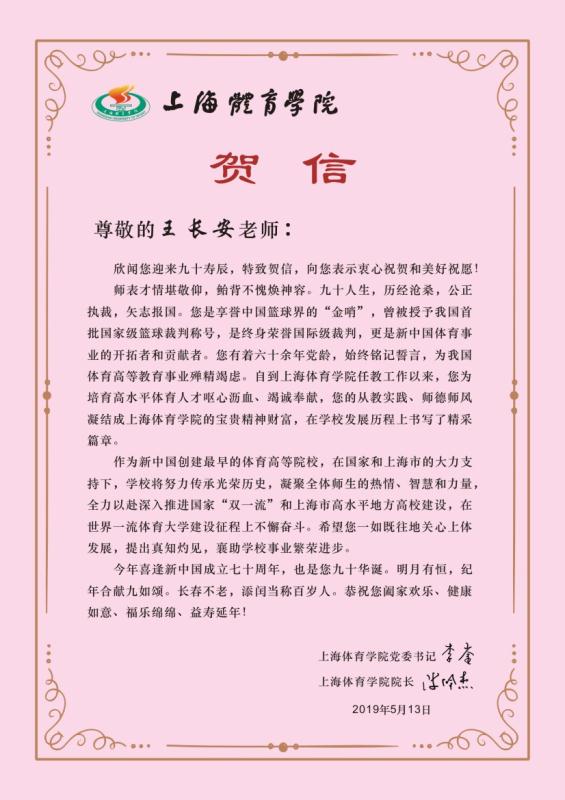 师表才情堪敬仰,鲐背不愧焕神容。九十人生,历经沧桑,公正执裁,矢志报国。您是享誉中国篮球界的“金哨”,曾被授予我国首批国家级篮球裁判称号,是终身荣誉国际级裁判,更是新中国体育事业的开拓者和贡献者。您有着六十余年党龄,始终铭记誓言,为我国体育高等教育事业殚精竭虑。自到上海体育学院任教工作以来,您为培育高水平体育人才呕心沥血、竭诚奉献,您的从教实践、师德师风凝结成上海体育学院的宝贵精神财富,在学校发展历程上书写了精采篇章。