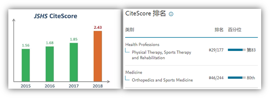 另外,爱思唯尔(Elsevier)本月也公布了最新的Scopus指数—CiteScore。JSHS2018年CiteScore为2.43(2017年为1.85),分别在物理治疗、运动疗法、康复(Physical Therapy, Sports Therapy andRehabilitation)和骨科、运动医学(Orthopedics and Sports Medicine)学科中排名29/177和46/244(2017年排名分别为44/165和71/237),亦双双进入Q1区域。