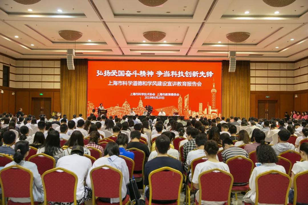 本网讯 为贯彻落实《关于进一步加强科研诚信建设的若干意见》和《关于进一步弘扬科学家精神加强作风和学风建设的意见》,坚持立德树人,营造优良学风环境,上海市科协和市教委于6月20日下午在上海科学会堂国际会议室,成功举办“弘扬爱国奋斗精神 争做科技创新先锋——2019年上海市科学道德和学风建设宣讲教育报告会”。大会由市科协党组成员、副巡视员黄兴华主持,市教委副主任毛丽娟致辞,并邀请了中国科学院院士、中科院上海分院副院长张旭研究员,上海市教书育人楷模、上海交通大学刘西拉教授作报告。我校研工部老师带领我校数位研究生代表积极参会。