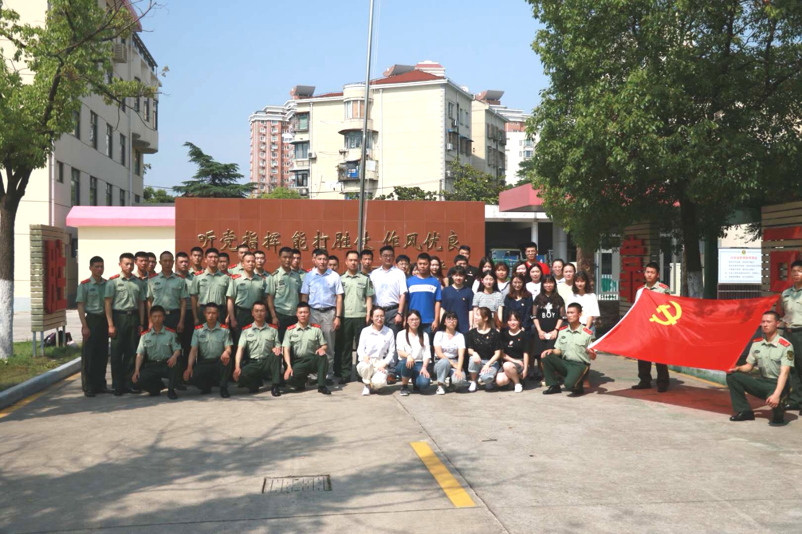 参观结束后,在“听党指挥、能打胜仗、作风优良”标语墙前,本科生第一党支部书记徐共强带领我院新发展党员面向党旗庄严宣誓,其他师生党员与武警官兵党员一同重温入党誓词。