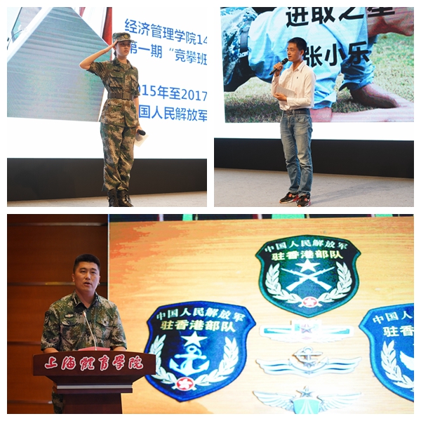 在退伍学生徐穗、张小乐和教师代表樊思聪的叙述中,全场师生一同回顾了他们的军旅生涯。“当我得知我即将服役于酒泉卫星发射中心的时候,心情是激动而又充满想象的,那些火箭发射、飞船升空的景象萦绕在我的脑海里。”徐穗这样回忆军旅初始的情景。“我得知自己成为一名驻港部队仪仗兵的时候,是非常激动和兴奋的。”樊老师回忆道。