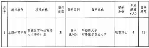 该创新项目为我校同日本早稻田大学以及比利时布鲁塞尔自由大学的博士生联合培养项目:国家留学基金委将为选派人员资助一次往返国际旅费和规定期间(该创新项目为12个月)的奖学金生活费,资助标准及方式按照国家有关规定执行;上海体育学院将根据选派人员完成学业的情况承担50%的学费。选派人员达到双方学校的毕业要求后可获得上海体育学院及日本早稻田大学或比利时布鲁塞尔自由大学颁发的双学位。
