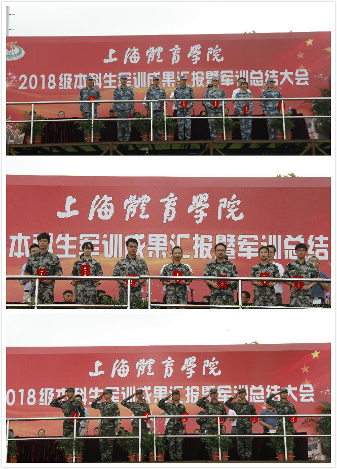 上海体育学院副院长王陈宣布军训团表彰决定,64名同学荣获“优秀学员”称号,4名同学荣获“优秀通讯员”光荣称号,13名参训教师荣获“优秀指导员”,20名承训教官荣获“优秀教官”光荣称号。在全体军训团成员的共同见证下,领导嘉宾为获奖代表颁奖。