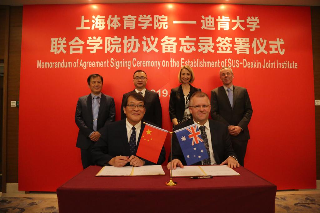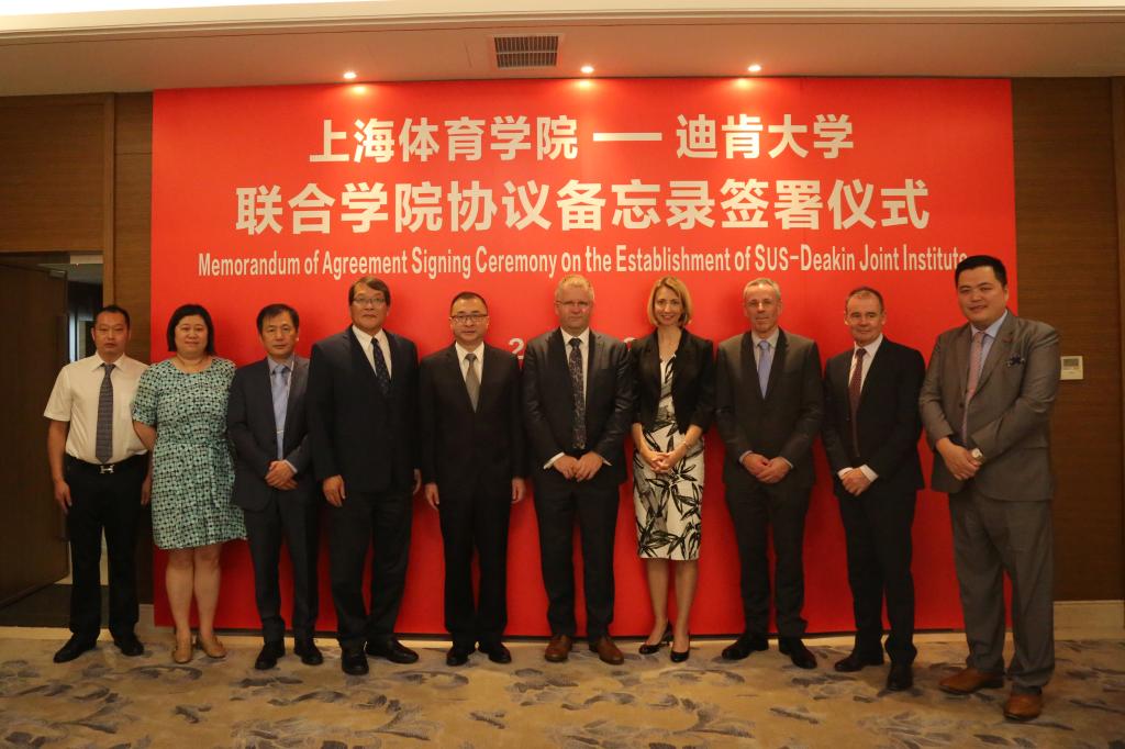 本网讯 8月22日上午,上海体育学院-迪肯大学联合学院协议备忘录签署仪式在我校交流中心举行。在澳驻沪代理总领事卡特丽娜和上海体育学院党委书记李崟见证下,上海体育学院党委副书记、院长陈佩杰和迪肯大学校长伊恩·马丁代表双方学校签署了《上海体育学院-迪肯大学联合学院协议备忘录》。出席签署仪式的还有上海体育学院副院长王兴放、国际交流处处长沈佳和教务处副处长卢文云,迪肯大学常务副校长加里·史密斯、国际事务副校长约翰·莫洛尼及国际关系副校长沈伟。