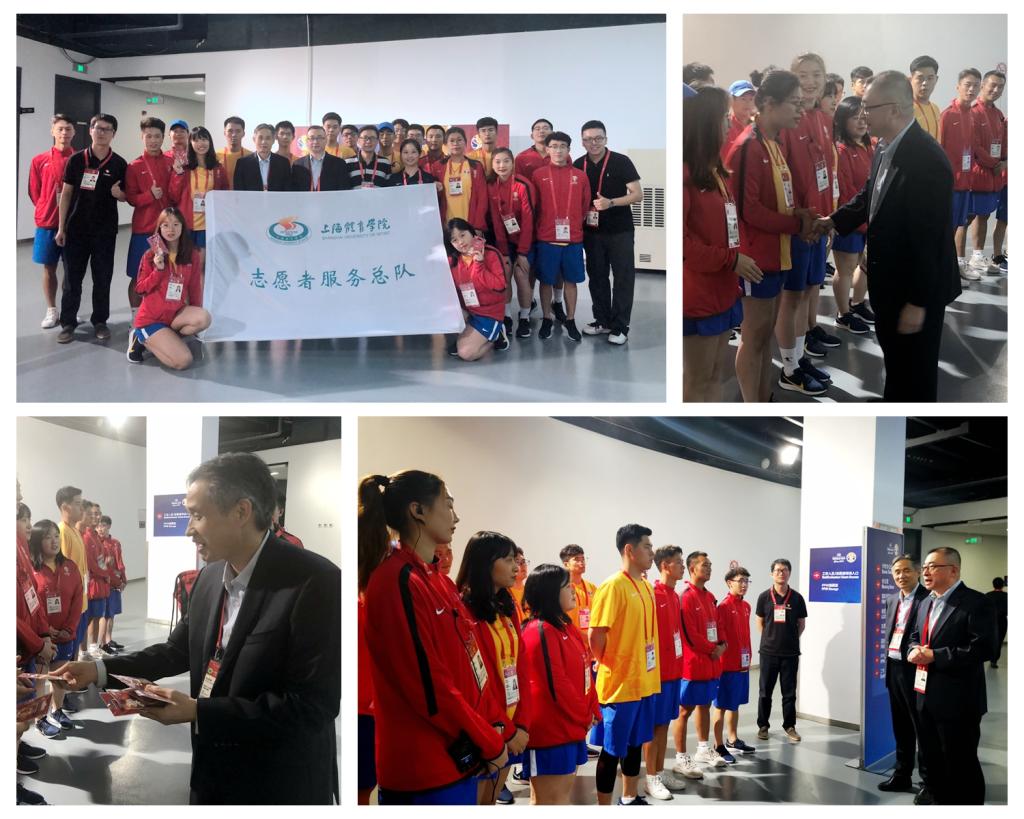 9月5日,学校党委书记李崟,党委副书记、副院长陈晓峰到赛场看望并慰问志愿者,为上体志愿者的奉献友爱与竞攀精神点赞。李崟对志愿者连日来的工作给予了充分肯定,也希望大家能把握住这次难得的机会,近距离地感受世界级的体育赛事,认真做好服务工作,做一名优秀的“体育人”。陈晓峰鼓励同学继续发扬上体精神,将小火炬的风采展现在世界杯的赛场。上海市体育局竞赛处副处长郑浩彬、体育局团委副书记崔燕以及我校团委书记陈鸿、团委副书记杜恺一同前往东方体育中心为“小火炬”点赞。