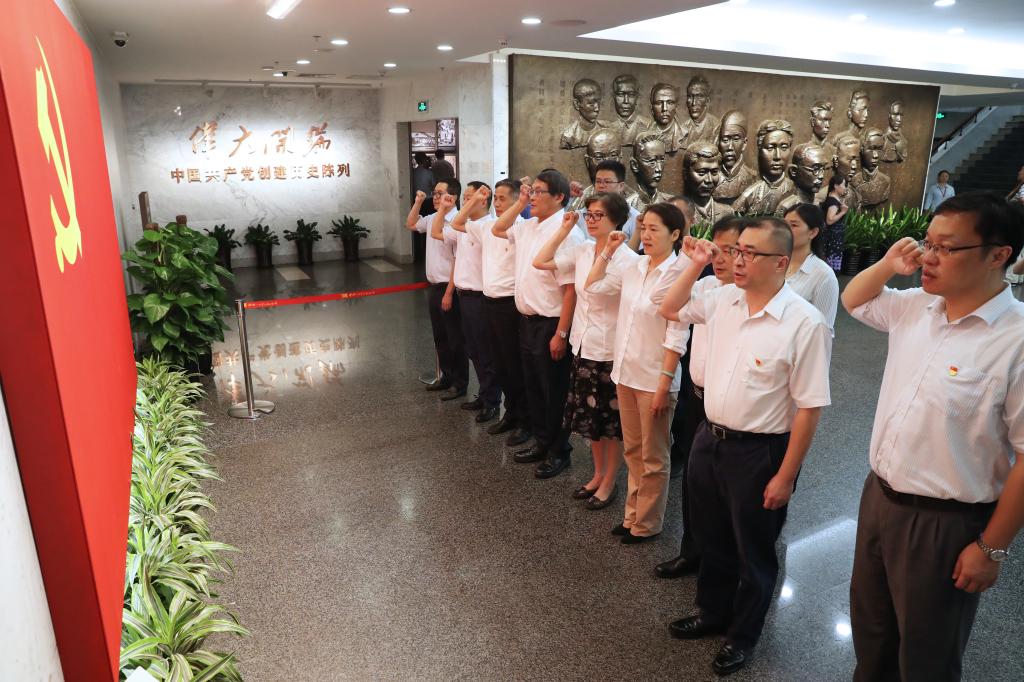 大家首先来到中共一大会址纪念馆的宣誓厅,在党委书记李崟的带领下,面向党旗,进行了庄严的宣誓教育,通过重温入党誓词,牢记党的宗旨,时刻不忘初心和使命,矢志永远奋斗。