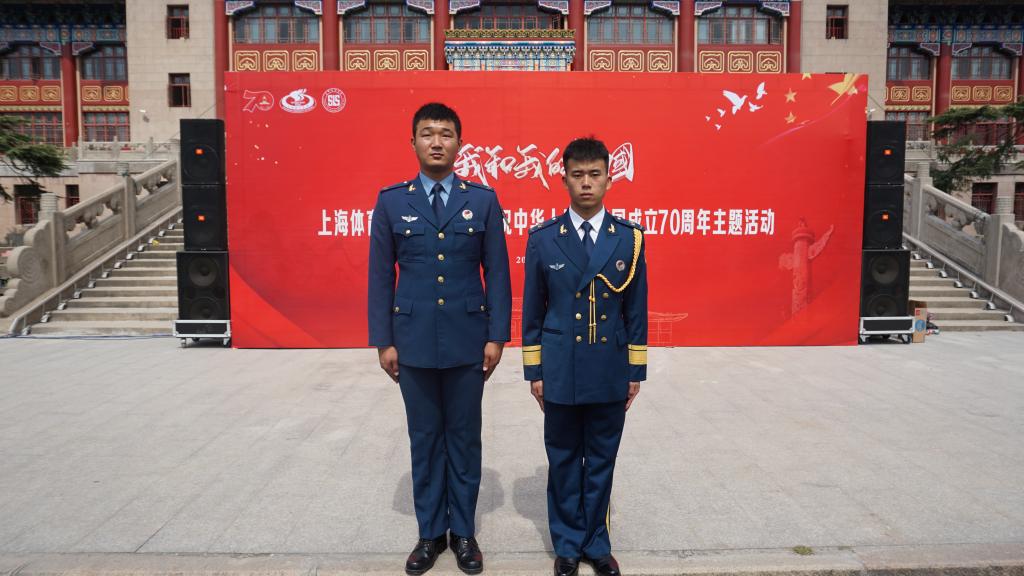 “我的祖国和我,像海和浪花一朵”,跟随歌曲的节奏我院花样跳绳、空竹、轮滑项目的同学对歌曲进行别样的演绎;16级学生胡晨旭、吕鑫隆身穿空军军装,英姿焕发地站在队伍当中,