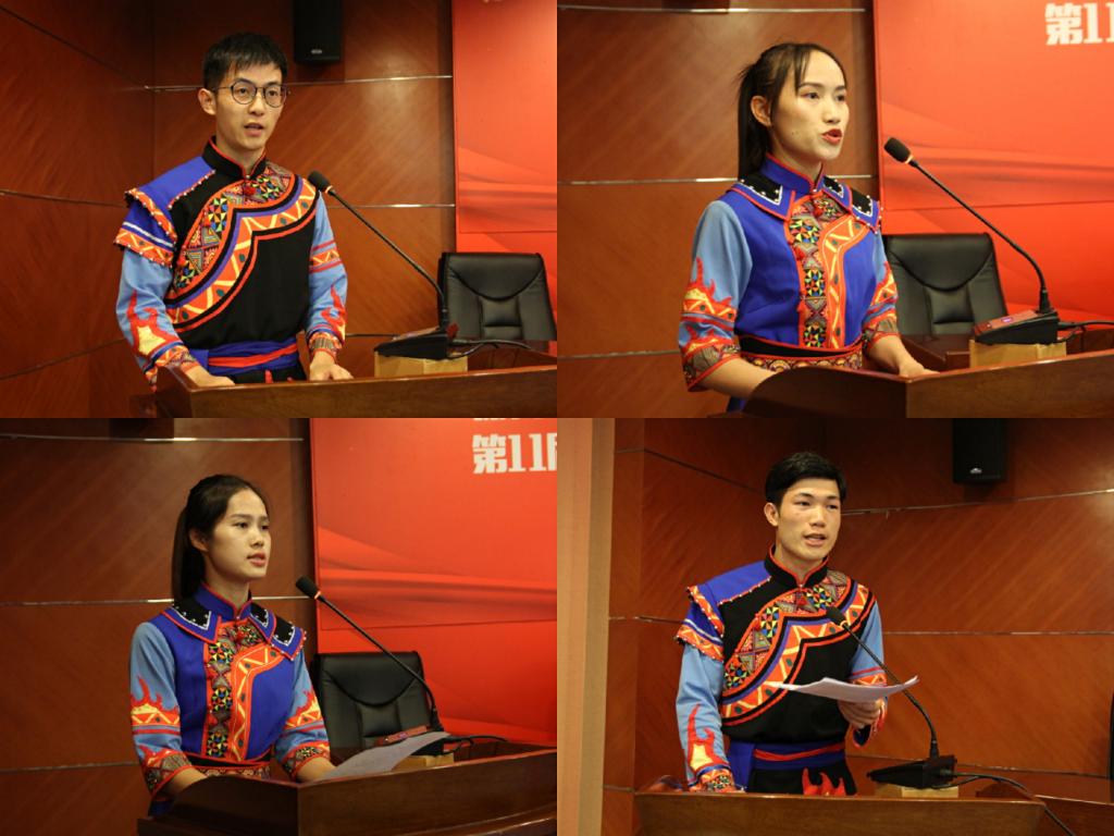 四名学生代表进行了分享。我院学生韦冬玲被全国政协主席汪洋亲切接见,作为一名普通的少数民族大学生,深切地感受到了国家领导人对少数民族同胞的关心与爱护,通过这一次民族盛会,增进了各民族的交流,促进各民族像石榴籽一样紧紧抱在一起,共同捧起民族团结的“最高奖杯”。学生代表劳鹏是来自于少数民族自治区的同学,他表示很荣幸担任上海代表团的护旗手,自豪感、荣誉感油然而生,在绿瓦求学的四年,从一开始比赛的失利到现如今的队伍主力,不仅仅增长了才干,也学会了责任与担当。作为临时党支部副书记的陆雨晨,已是研三的同学,他克服学业的压力、毕业就业的困难,积极参与到训练中来,团结各民族同学,在队伍中发挥模范带头作用。作为花样跳绳队的队长覃继媚,需要协助领队、教练管理横跨6个本硕年级8个民族20名队员,通过这一根小小的绳子让团队跳出了上体特色,跳出了民族大团结。