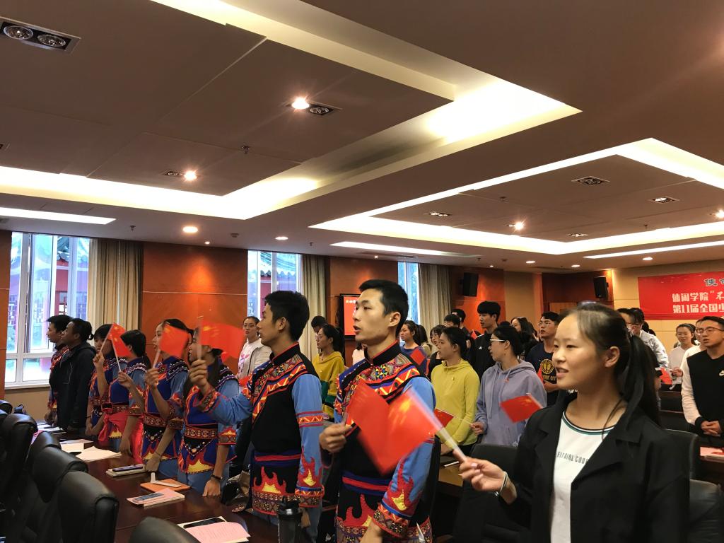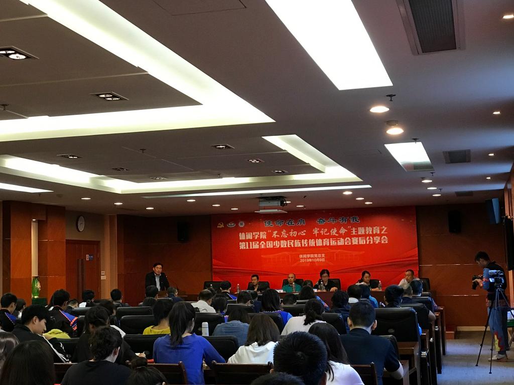 本网讯 10月9日下午,休闲学院在图文信息楼第二会议室举行“不忘初心、牢记使命”主题教育之“使命在肩、奋斗有我”第十一届全国少数民族传统体育运动会赛后分享会。党委副书记、纪委书记詹萌,组织部、统战部部长王继红、训竞处处长邵斌、休闲学院领导班子及全体教职工、学生党员参加了本次活动。分享会由休闲学院副书记、副院长顾郑军主持。