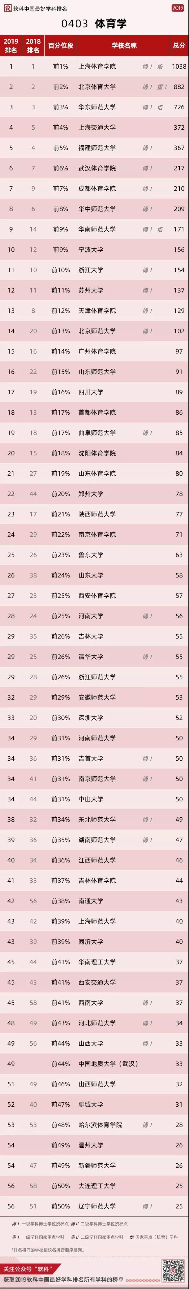 10月30日,软科正式发布2019中国最好学科排名,体育学学科排名共有57所大学上榜,上海体育学院、北京体育大学和华东师范大学位列三甲。这也是我校连续第三年获得软科中国最好学科体育学排名第一。