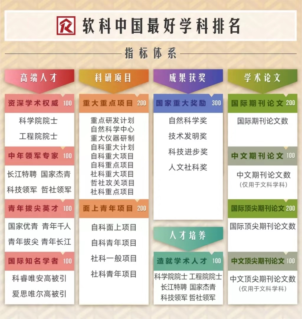 中国最好学科排名榜单包括96个一级学科,各个学科排名的对象是在该一级学科设有学术型研究生学位授权点的所有高校,发布的是在该学科排名前50%的高校。排名的指标体系由高端人才、科研项目、成果获奖、学术论文、人才培养5个指标类别组成,对应10余个指标维度,包括30余项测量指标。指标名称和权重如下图所示。