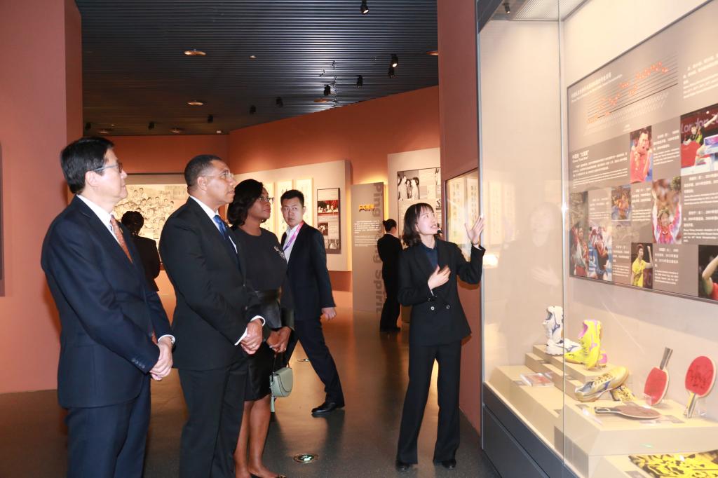参观活动尾声,李崟书记向霍尔尼斯总理赠送礼物并邀请总理在留言册上写下寄语。霍尔尼斯总理表示,乒乓球是他年少时期最喜爱的运动项目。此次到访乒博馆,给他带去了很多启迪和思考,希望未来进一步深化中国和牙买加两国乒乓球项目乃至整个体育和人文方面的务实合作,不断推动两国关系顺利发展,促进地区之间交流繁荣。