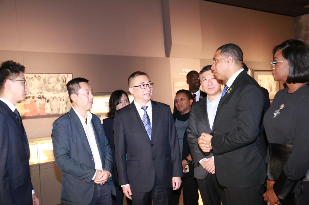 中国驻牙买加大使田琦和牙买加驻华大使丘伟基陪同参观。