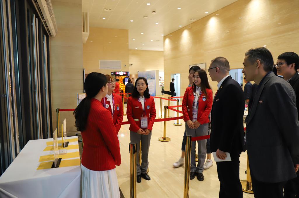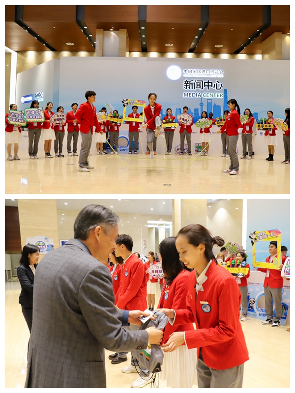 在新闻中心一层大厅,校领导和新闻中心领导观看了上体小叶子们充满活力的进博会志愿者主题歌《年轻的力量》快闪展示和活力十足的花样跳绳表演,校领导向志愿者代表分发了“进博加油包”,并为志愿者们佩戴“德智体美劳”绿瓦小火炬形象徽章。我校在今年的思政教育中开展了“五星·五环·五情”主题教育活动,并结合“德智体美劳”设计推出了“五环小火炬”形象,该形象于本次进博会志愿服务活动中亮相,五个小火炬形象分别代表“德智体美劳”五个字。学校也在进博会现场组织成立了临时党团支部,号召志愿者围绕“德智体美劳”开展打卡活动,争做“五星五环”小火炬,为保障进博会贡献青春力量。慰问活动在一张齐声呐喊“上体小叶子,加油”的合影中结束。在媒体中心的国内外记者,也都自发地用相机和手机记录下我校小火炬青春洋溢而又充满创意的活动现场。
