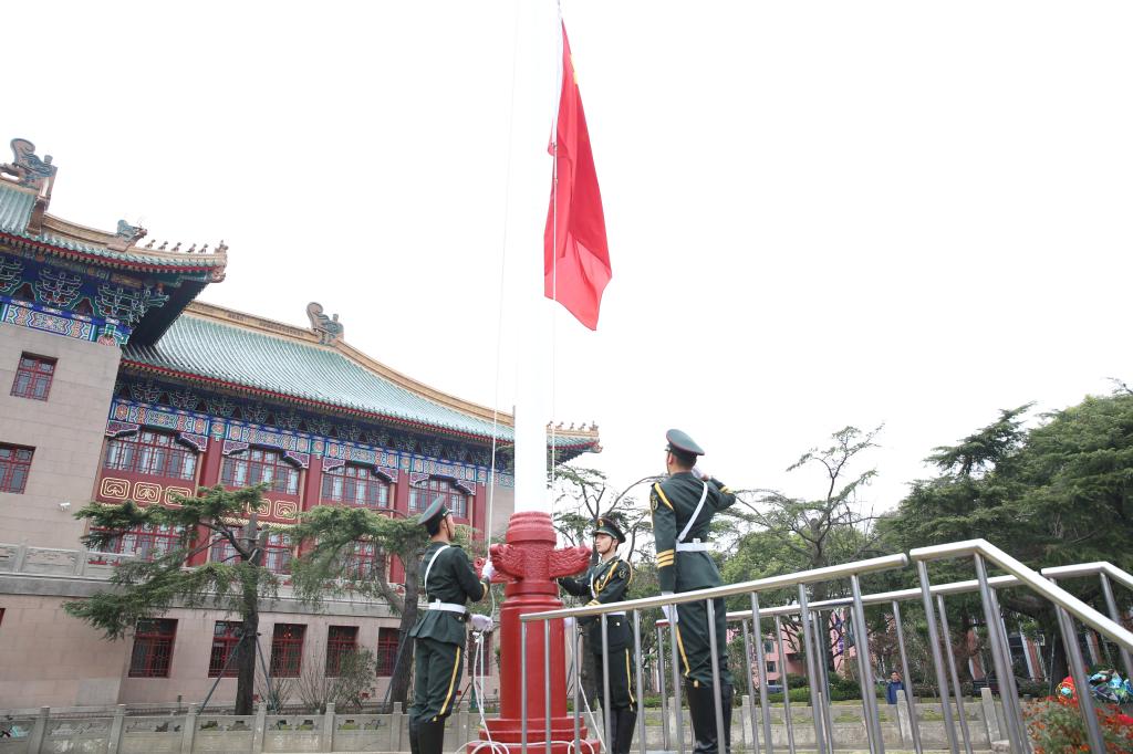 我校仪仗队完成了升国旗、奏唱国歌及升校旗、奏校歌仪式。