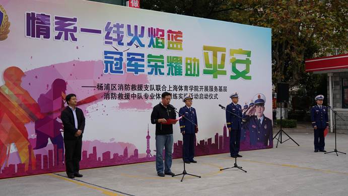 本网讯 11月12日,体育教育训练学院与杨浦区消防救援支队隆重举行情系一线“火焰蓝”冠军荣耀助平安——上海体育学院体育教育训练学院服务基层消防救援中队专业体能训练实践活动的启动仪式。体育教育训练学院党委书记徐烈、党委副书记、副院长曹智超、杨浦区消防救援支队副支队长张春卫、政治处主任吴悦、杨浦消防救援支队内江中队政治指导员方汉文、中队长王方明、副政治指导员张吉欢与体教本科生党支部书记许丁晨、体训学院学生党员代表、入党积极分子代表、消防指战员代表共同参加启动仪式,活动由杨浦区消防救援支队政治处干部科科长詹志凯主持。