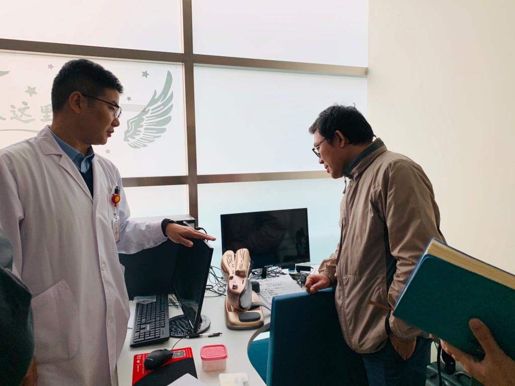随后,我校一行来到华山医院东院,负责实习工作的徐东艳老师对我校一行的到来表示热烈的欢迎和诚挚的感谢。据徐老师介绍,华山医院目前主要开展综合性康复医疗工作,包括物理治疗(PT)、作业治疗(OT)、言语治疗 (ST)、娱乐治疗(RT)、吞咽障碍治疗、支具矫形器、针灸和推拿等现代康复治疗与中国传统治疗相结合的综合性康复治疗为特色。他带领大家参观各治疗室和病房,并介绍了目前所用的主要治疗仪器功能及使用情况。目前,我院正在紧张筹备WCPT的认证工作,双方表达了进一步加强互动交流的合作意愿。当日,正在华山医院东院实习的16级康复治疗专业同学也来到现场,徐东艳重点介绍了实习生的工作情况,并对实习生的学习态度与专业技能提出了赞扬。