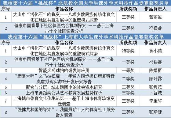 本次竞赛中,我校《健康中国背景下社区体医结合机制探究——基于上海市40个社区服务点调查分析》和《大山中“活化石”的蜕变与重生:以少数民族传统体育文化的生态现状为思考》两项作品经过市赛的激烈角逐晋级全国赛,最终荣获第十六届“挑战杯”北航投全国大学生课外学术科技作品全国三等奖。