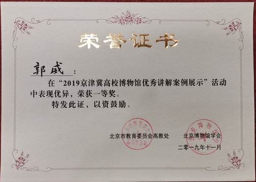 “2019京津冀高校博物馆优秀讲解案例展示活动”颁奖仪式正式启动。此次展示活动自2019年10月初在中国传媒大学传媒博物馆正式启动,共有全国30余所高校博物馆的80余名讲解员参与本届案例展示活,在参赛规模和选手水平都创历史新高。在优秀讲解案例展示活动中,经过初评和复评,本馆讲解员郭威通过精彩的讲解和展示最终荣获一等奖,并得到专家评委的一致好评。本馆常务副馆长王震参加“中国高校博物馆馆长论坛”并代表领奖。