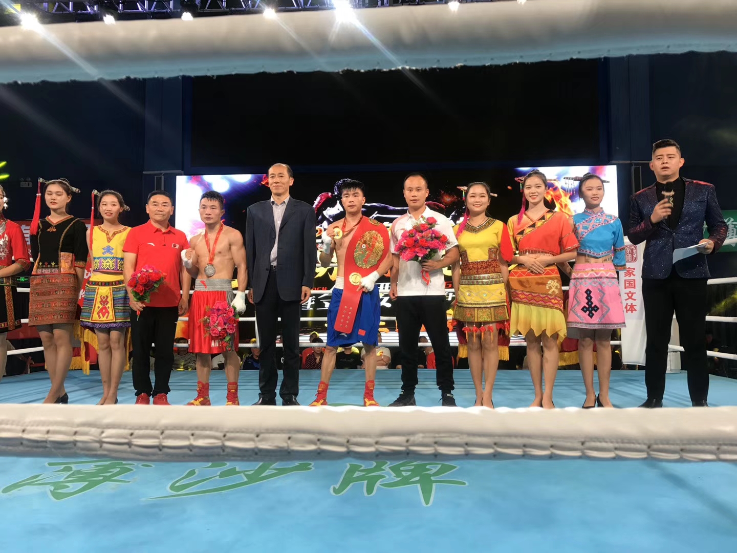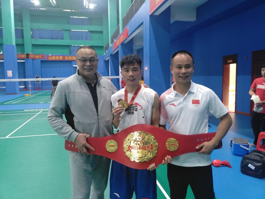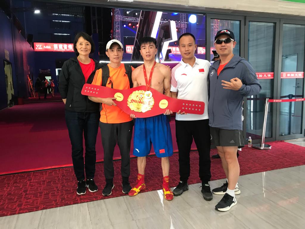 本网讯 12月1日,2019年全国男子拳击冠军赛暨金腰带争霸赛经过一个多月的激烈角逐,在海南白沙落下帷幕。我校选手国家队主力队员胡建关获得52kg级冠军,摘得该级别“拳王金腰带”。施之皓副院长到现场慰问运动员为胡建关加油鼓劲。