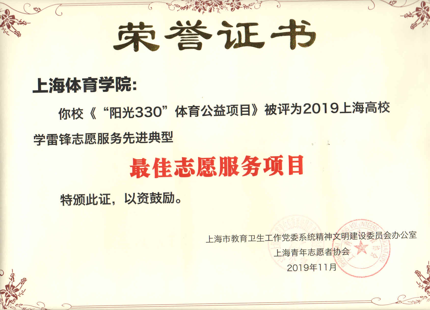 本网讯 近日,上海市教委工作党委系统举办的2019年度上海市“优秀志愿者、优秀志愿服务团队”评选展示活动圆满结束。我校“阳光330”体育公益项目荣获2019上海高校学雷锋志愿服务先进典型“最佳服务项目”奖。今年,“阳光330”还获得了上海市共青团“往社区走”志愿服务“十大示范项目”及2019“公益之申”十佳校园公益项目。