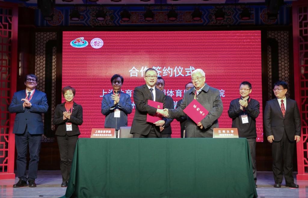 揭牌仪式后,举行了上海体育学院中国体育历史研究院与兰州大学敦煌学研究所合作签约仪式。上海体育学院党委书记、中国体育历史研究院院长李崟与兰州大学敦煌学研究所所长郑炳林分别代表双方进行签约。本着“着眼长远、优势互补、共同发展”的原则,双方将进一步加强在理论研究、人才培养、保护传承、创新发展、传播交流等方面的合作,为专家学者和研究生提供学术交流的空间,推动中国体育历史研究、敦煌学研究取得重大突破。