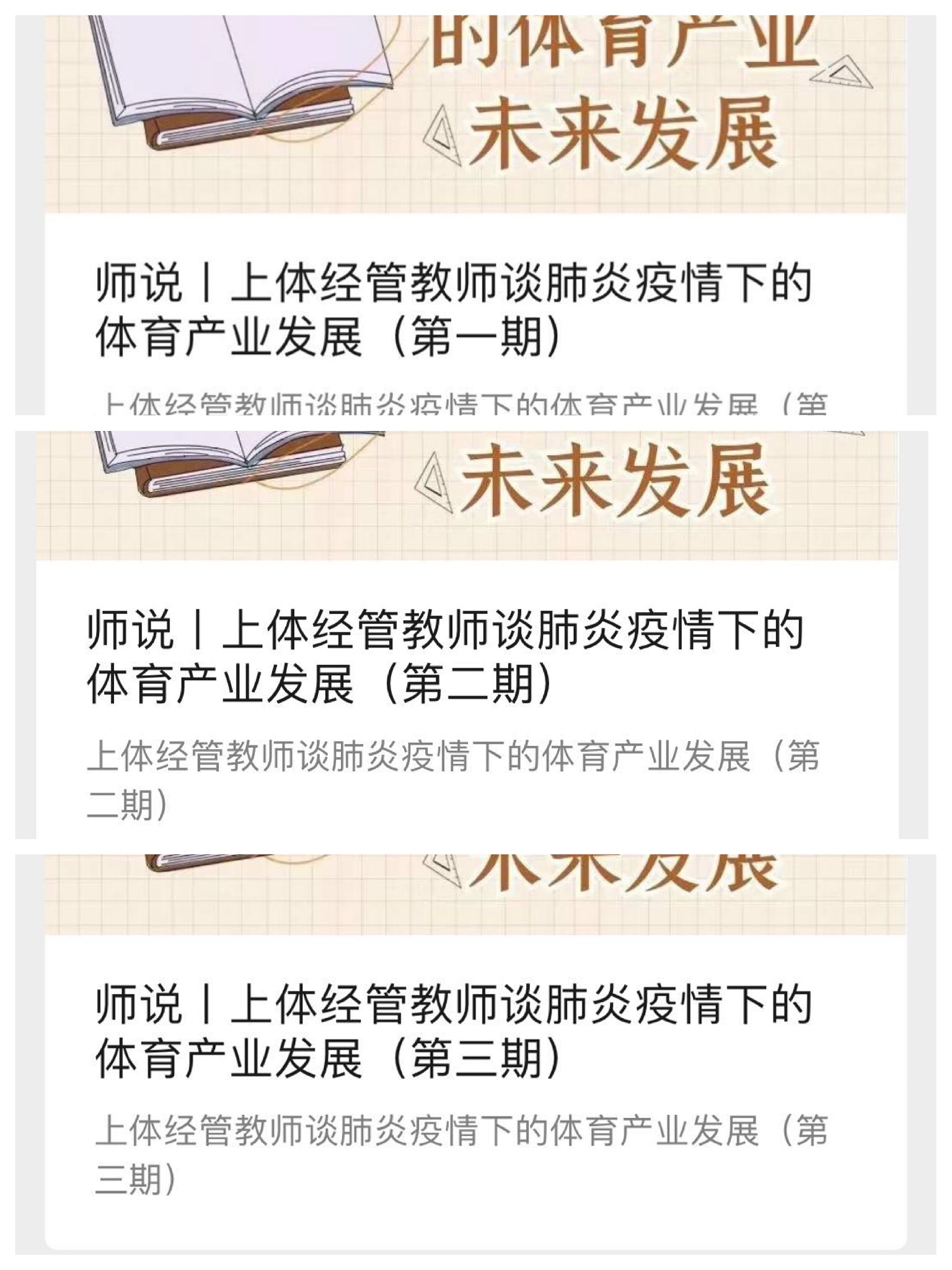 本网讯 2月15日-17日,由我校经管学院12名教师联手打造的《肺炎疫情下的体育产业未来发展》专题系列文章在经济管理学院官方微信平台发布。该专题从不同业态、不同视角阐述了新冠肺炎疫情下,体育产业面临的挑战与机遇、未来体育产业的发展走向、特殊社会生活节奏引发的新需求等,为广大读者解码疫情重创之下体育产业发展的变革之路。
