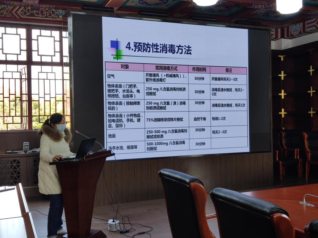本网讯 当前,新型冠状病毒肺炎疫情防控阻击战进入关键阶段。按照学校新型冠状病毒肺炎疫情防控工作领导小组工作部署,为提高学校后勤、隔离观察点等一线人员对新型冠状病毒的认识,全面做好新冠肺炎防控及开学前准备工作,2月24日下午,后勤处组织伤骨科医院、交流中心、宿管、场馆等工作人员在绿瓦大楼二楼会议室开展了新型冠状病毒感染的肺炎防控知识专项培训,培训由后勤处副处长袁文君主持。