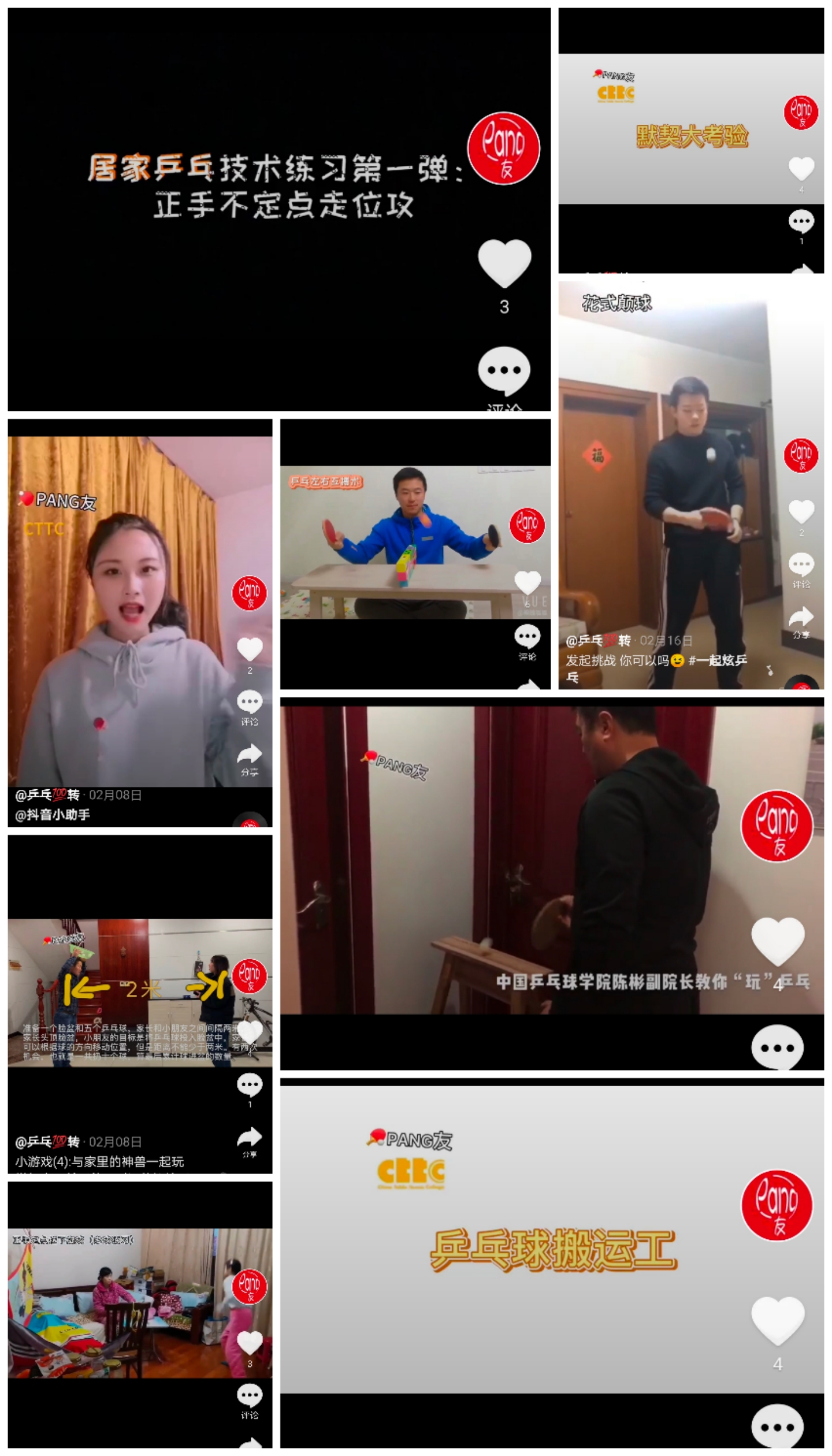 现实就是最鲜活的教材,能激起学生从感性到理性的思考。“如果没有合适的乒乓球台和活动空间,如何利用家庭的现有空间条件设计难度适宜的乒乓球游戏和锻炼方式?”教学部的完好老师带领学生团队在疫情期间创建了中乒学子自媒体抖音账号“乒乓100转”,打开脑洞,设计居家花式乒乓锻炼法,用自己的专业知识在线上发布抗疫健身视频,《乒乓球搬运工》《乒乓球默契大考验》等乒乓游戏得到网络上的广泛转播和点赞。