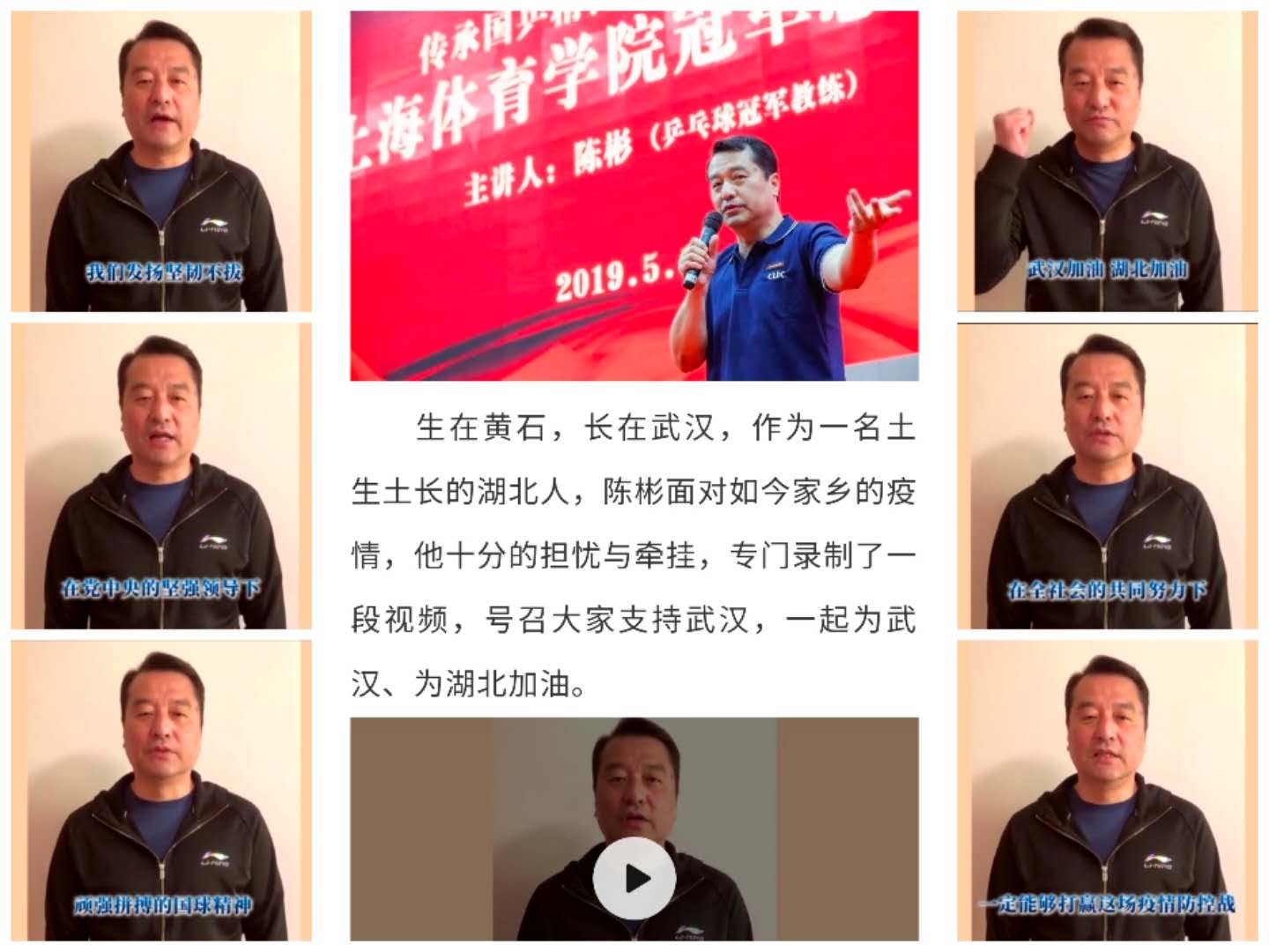 在学院党委领导下,党员干部、广大师生积极响应党中央号召,踊跃捐款,用实际行动践行初心使命。我院副院长,原中国乒乓球队教练、湖北籍陈彬教授面对家乡疫情,十分担忧与牵挂,第一时间录制视频声援家乡,号召中乒院全体师生一起为武汉加油、为湖北加油。