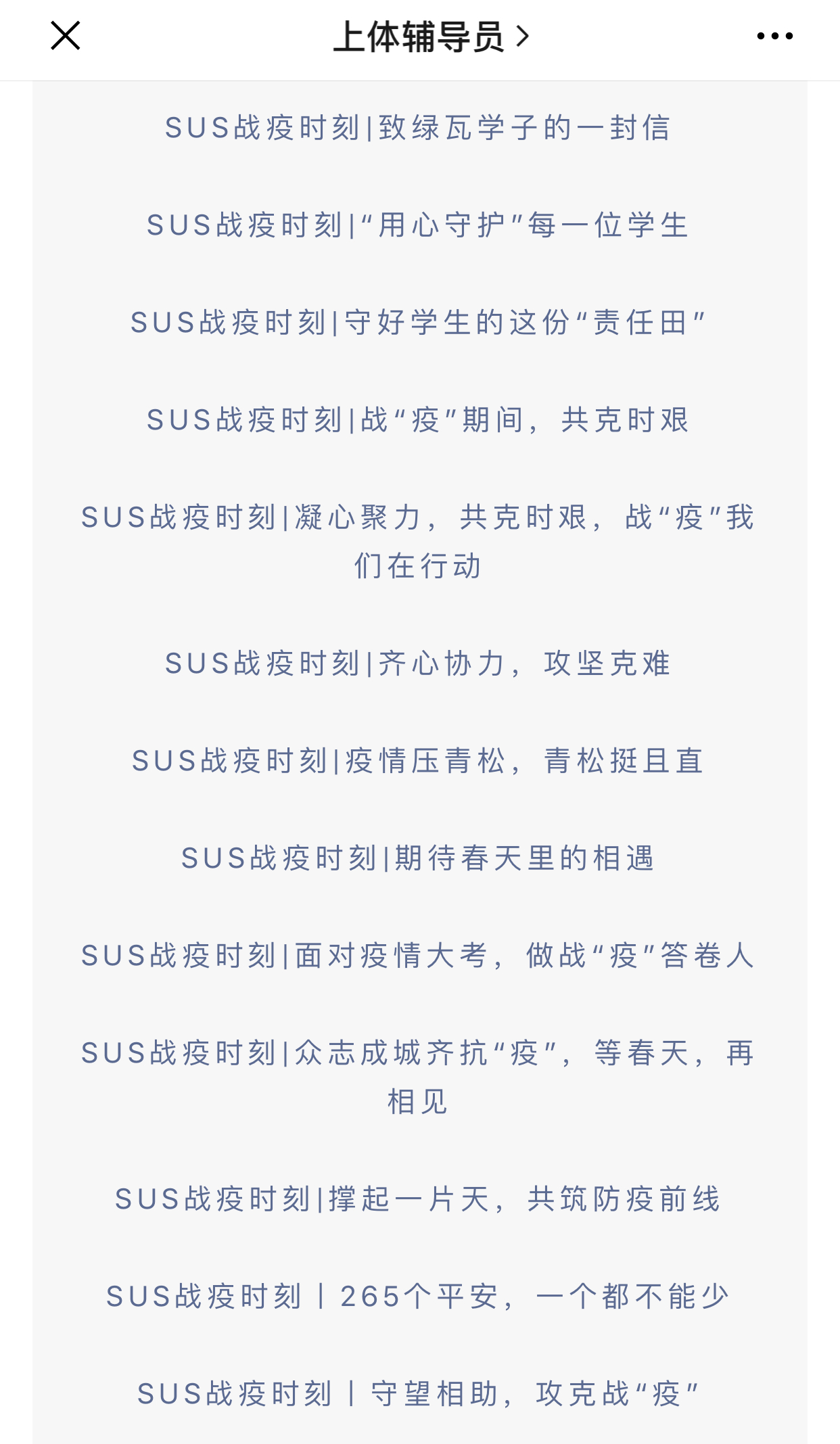 “使命在肩,一线有我”,彰显了上体辅导员的责任与使命。通过学习与反馈,学生们也开始更多地思考,作为上体青年,应该如何更好地发挥作用,投入到抗击疫情地战疫中,展现绿瓦学子的精神风貌。在这场疫情防控工作中,上体学工队伍牢记立德树人目标,勇担育人使命;以安全稳定为前提,构建疫情期间网络工作体系,做好各类数据排摸;制定特殊时期就业、心理、资助等专项工作方案,助力相关工作开展;全方面推进网络思政育人模式,打造体院特色网络思政平台,打造“战疫行动”思政微课直播平台;突出抓好大学生思想政治引领、自信教育,注重政治引领的内容供给,把疫情防控工作转化为“四个自信”教育的生动实践。