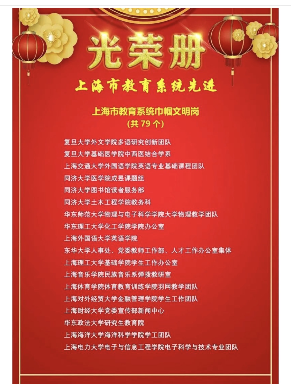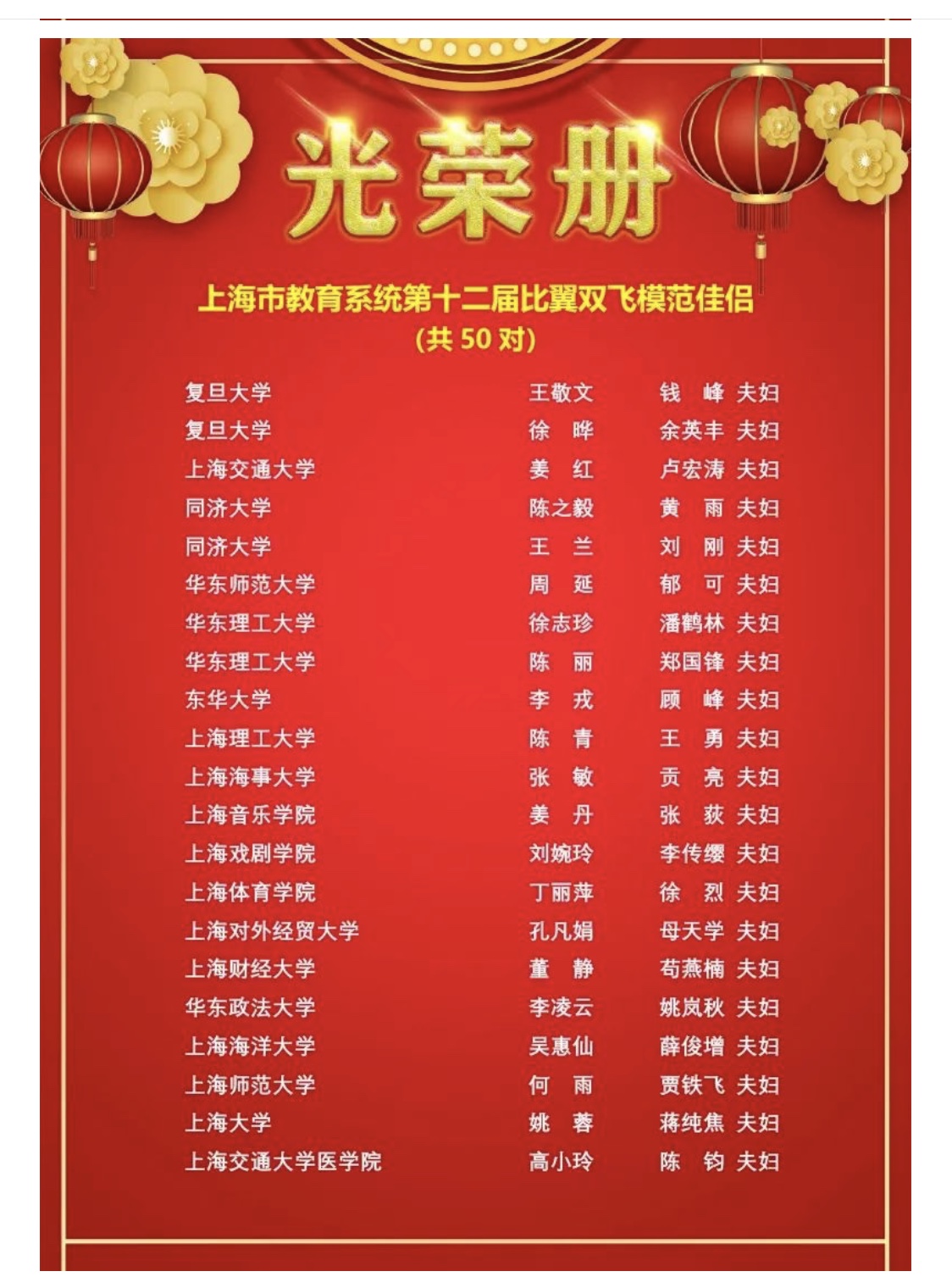 本网讯 在春意盎然之际,迎来了第110个“三八”国际妇女节。为表彰先进、树立榜样,进一步倡导教育系统广大妇女“做新时代女性,共建卓越城市,共创美好生活”,经上海市教育系统妇女工作委员会、上海市教育工会女教职工委员会组织评选,一批优秀集体和个人获得全国、上海市及上海教育系统各类荣誉称号。我校体育教育训练学院史芙英老师带领的羽网教学团队获“2019年度上海市教育系统巾帼文明岗”,我校丁丽萍、徐烈夫妇获“上海市教育系统第12届比翼双飞模范佳侣”。