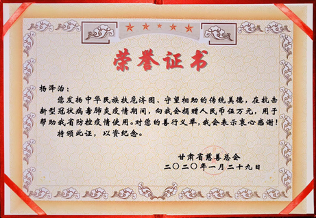 本网讯 日前,家在甘肃的我校经济管理学院2017级体育经济与管理专业的杨泽治同学收到了甘肃省慈善总会认证的捐款荣誉证书。他于1月29日向甘肃省慈善总会捐助了人民币5万元整助力新冠疫情防控工作。