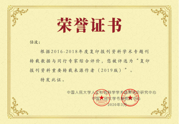 本网讯 日前,由中国人民大学人文社会科学学术成果评价研究中心和中国人民大学书报资料中心联合研制的《复印报刊资料重要转载来源作者(2019版)》成果面向社会正式发布。我校经济管理学院体育管理专业在读博士研究生任波,获得“复印报刊资料重要转载来源作者(2019年版)”。