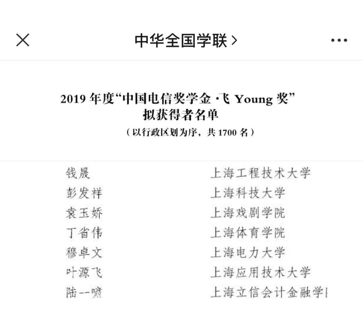 此次评选面向全国高校开展,由团中央、中国电信集团、全国学联及教育部、中国科协、中国青年报社、中国青年网等方面有关专家参加的全国评审会,共遴选出1700名“中国电信奖学金·飞Young奖”获得该奖项,上海市高校共有50名学生获得“飞Young奖”。
