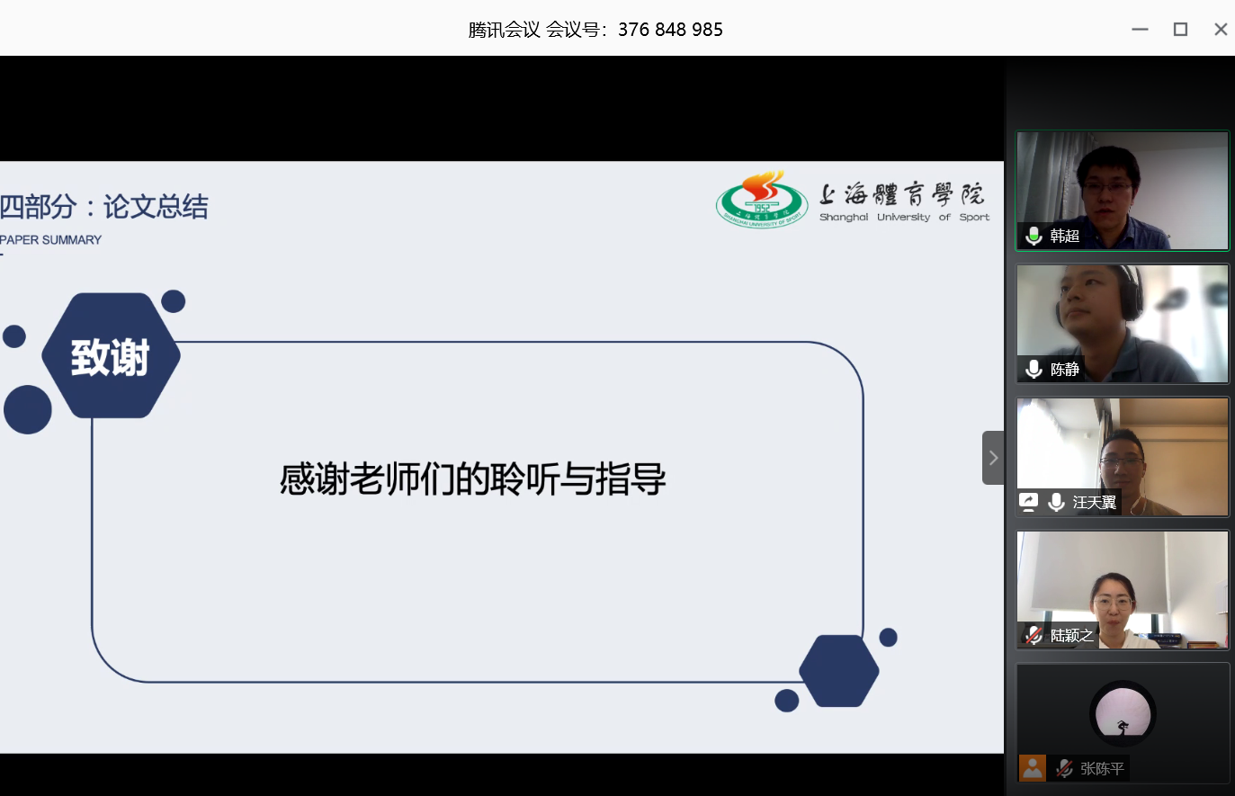 受新冠疫情的影响,本次答辩全部采用线上视频会议的形式进行。为保障线上答辩有序进行,根据研究生处制定的《关于调整2020年上半年我校毕业硕士研究生学位论文答辩工作的通知》以及《上海体育学院硕士研究生学位论文答辩会程序(2020版)》,心理学院结合本院的实际情况制定了详细的答辩工作方案,并在答辩前进行模拟预演,确保答辩的流畅性、答辩学生能够熟练操作以及PPT共享、麦克风、摄像头、录屏等功能的正常运行,答辩后,配合相关职能部门做好答辩材料的提交和归档等工作。