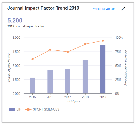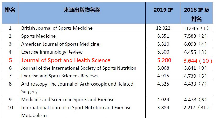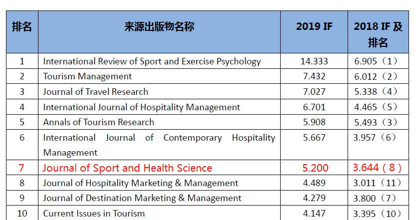 本网讯 北京时间2020年6月29日,科睿唯安(Clarivate Analytics)公布了《期刊引证报告》(JCR)最新数据,我校主办的Journal of Sport and Health Science(中文刊名《运动与健康科学(英文)》)影响因子跃升至5.2(去年为3.644),学科排名亦大幅提高:在85种被SCI收录的体育类期刊中排名第5(去年排名第10),位于Q1;在56种被SSCI收录的运动、休闲、旅游类期刊中排名第7(去年排名第8),位于Q1。