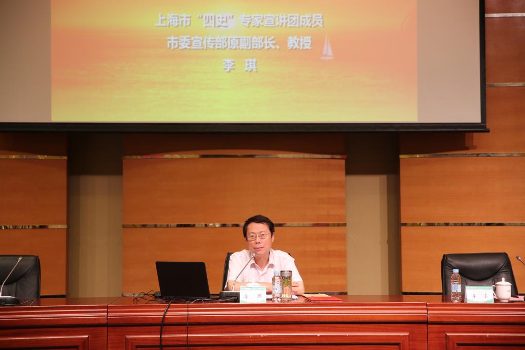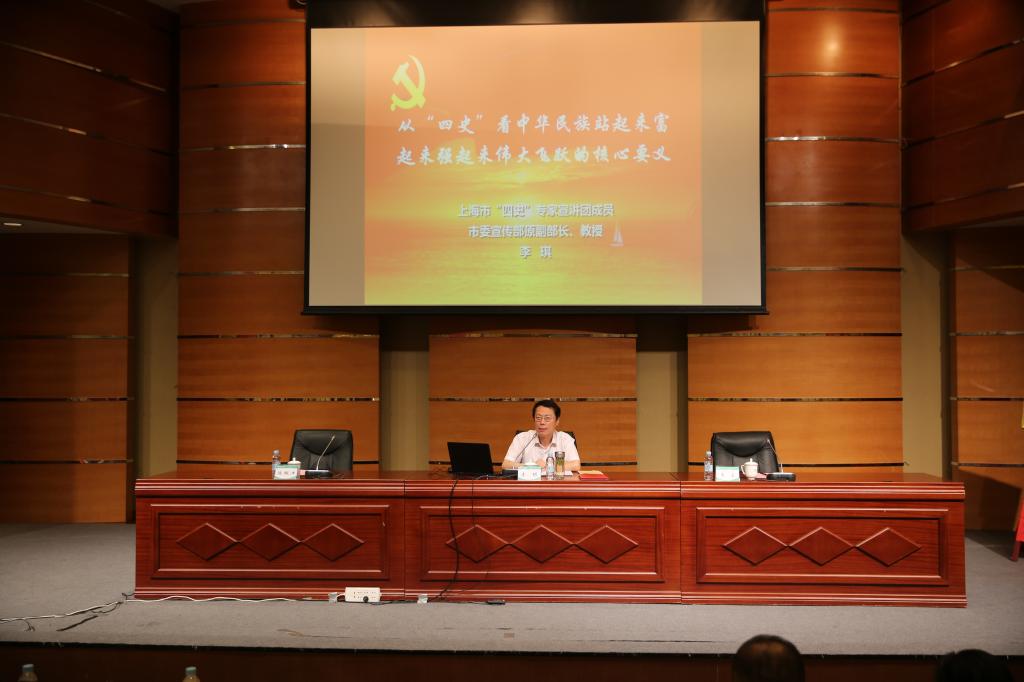 本网讯 7月15日下午,我校在图文信息楼报告厅举行“四史”学习教育专家报告会,邀请上海市“四史”专家宣讲团成员、上海市社联副主席、上海市中国特色社会主义理论体系研究中心副主任李琪教授作题为《从“四史”看中华民族站起来富起来强起来伟大飞跃的核心要义》的专题辅导报告。会议由党委书记李崟主持,校领导、党委理论学习中心组成员、中层干部、辅导员、马克思主义学院教师以及党支部书记代表参加学习。