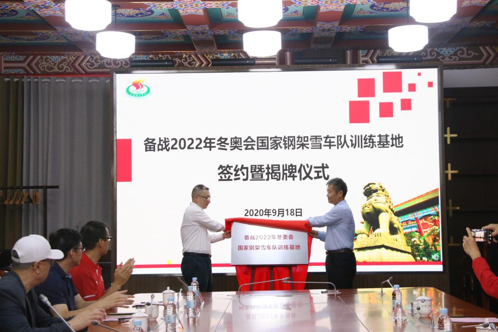 本网讯 9月18日上午,备战2022年冬奥会国家钢架雪车队训练基地签约暨揭牌仪式在上海体育学院绿瓦大楼第四会议室举行。国家体育总局冬季项目管理中心副主任孙远富与上海体育学院党委书记李崟为“备战2022年冬奥会国家钢架雪车队训练基地”共同揭牌,与上海体育学院副院长施之皓共同签署“备战2022年冬奥会国家钢架雪车队训练基地合作协议”。国家钢架雪车队领队孙帆,我校训练竞赛处、科研处、体育教育训练学院、上体附属体育医院主要负责人以及国家钢架雪车队全体队员等出席签约暨揭牌仪式。仪式上,上海体育学院党委书记李崟致欢迎辞,训练竞赛处处长邵春主持。