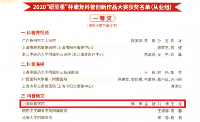 据悉,本次科普年会面向全国,采用线上线下相结合的办会形式,会议在上海设立1个线下主会场,同时在全国14个城市设21个线上分会场。本届全国康复科普创新作品大赛共分为科普微视频、科普海报和科普微文三大竞赛类别。最终在上千件作品中评出科普微文类一等奖作品3件,二等奖11件和三等奖20件。上海体育学院在从业组所有类别一等奖中脱颖而出,是一等奖作品单位中唯一一所高校而非医疗单位,彰显了我校运动康复“体医融合”的特色及在全国范围内的引领地位。