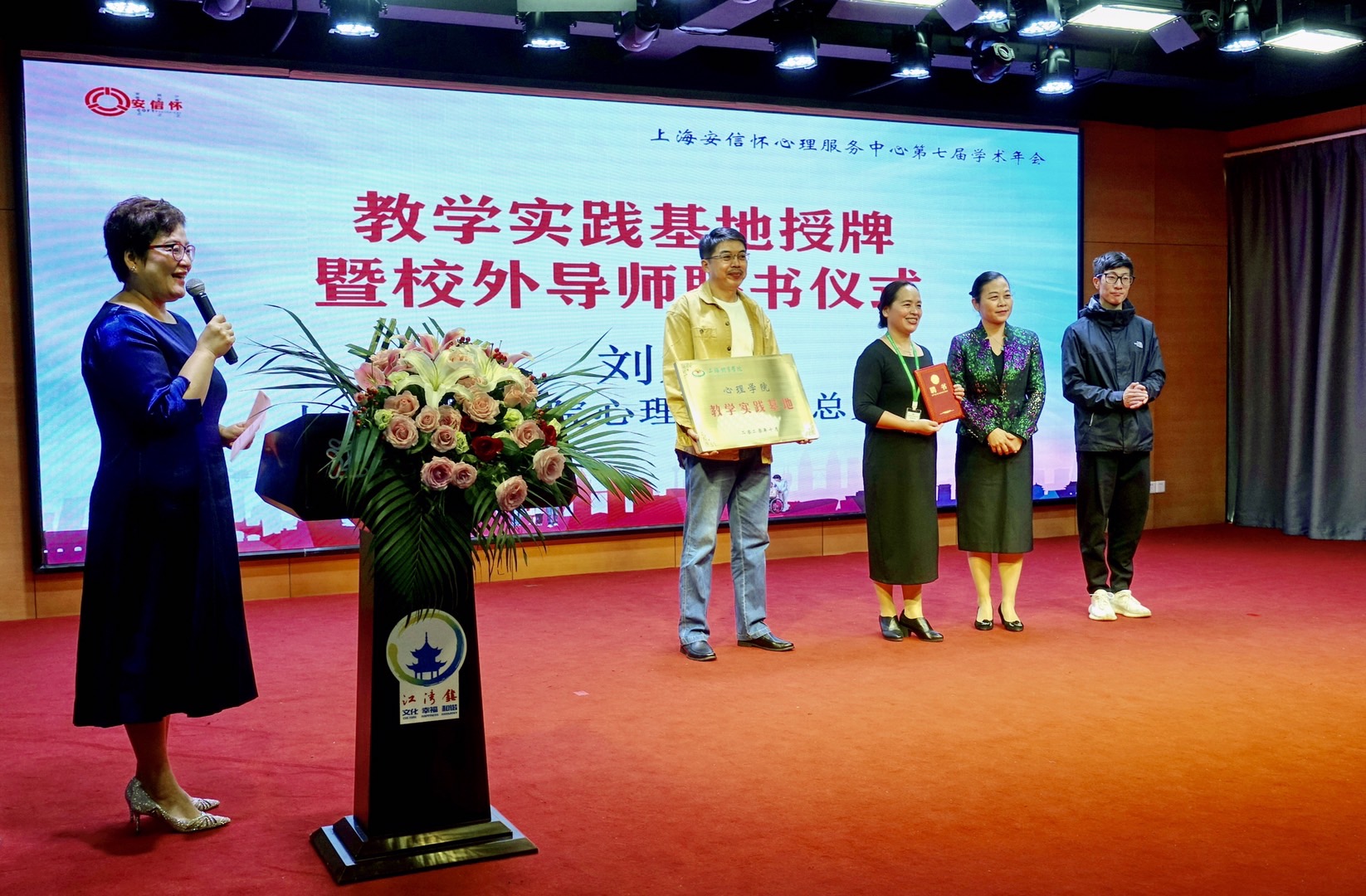 上海体育学院心理学院党总支书记刘宏为安信怀心理服务中心授牌,并为理事长周祝慧颁发校外导师聘书。