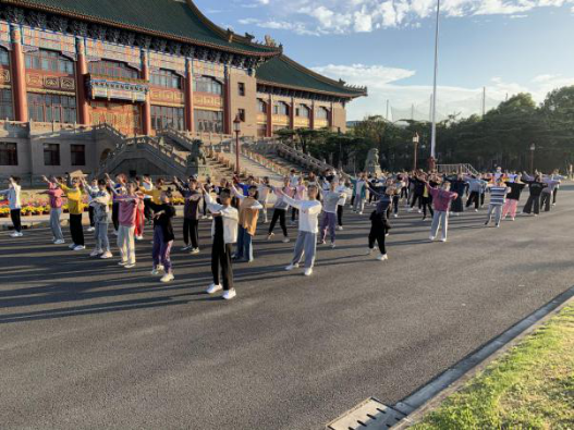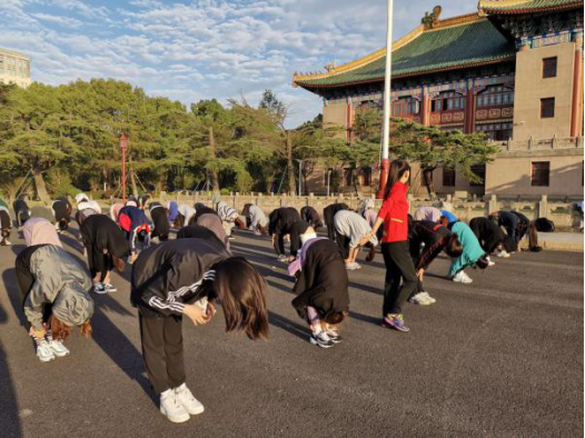 2020年10月19日早上6:30,传媒与艺术学院舞蹈编导专业学生迎着朝阳在专业教师的组织带领下,奔跑在校园里,绿瓦大楼前拉柔韧、踢腿、控制、跳跃和核心部位训练,专项技术练习以及口令、讲解与示范等能力训练,学生们练得积极而投入,构成了一幅努力拼搏、青春绽放的美丽画面。