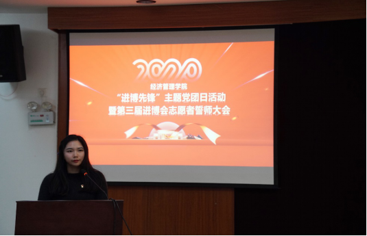 本网讯 经济管理学院于10月29日下午在学生活动中心二楼报告厅举行了“进博先锋”主题党团日活动暨第三届进博会志愿者誓师大会。活动以“学习四史、争当先锋、志愿世博”为主题,旨在进一步鼓舞士气、激发斗志,激励全体青年学生勤奋学习、扎实工作、奋发有为、助力世博。上海体育学院团委书记陈鸿、经济管理学院党委书记游林生、学院党委副书记、副院长王丽娜、组织员、学生党支部书记、经管学院进博会志愿者、全体学生党员、团员代表等出席了活动。活动由经管学院团委书记于卓言主持。