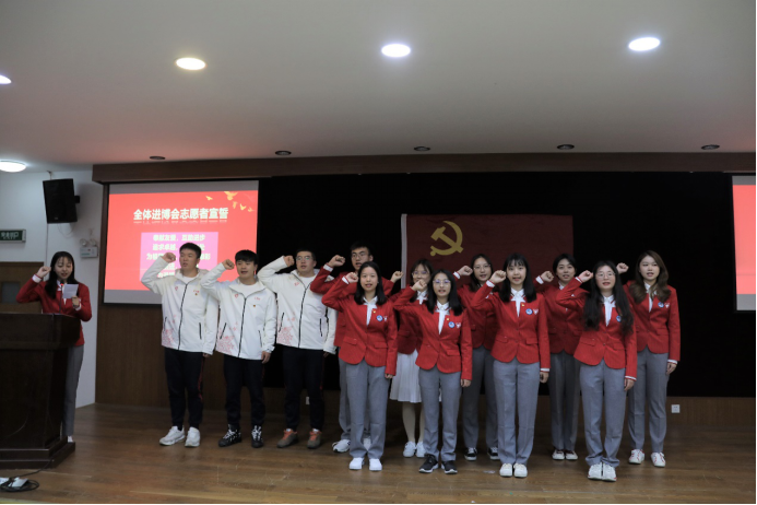在“亮红色身份、当进博先锋”环节,研究生第一党支部书记张扬与经管学院团委书记于卓言分别为进博会志愿者党员、团员佩戴党徽和团徽。