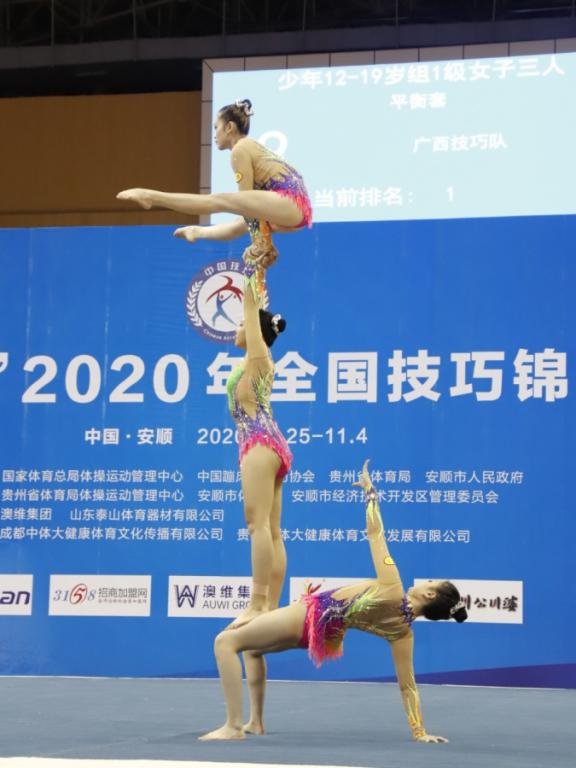 本网讯 2020年10月25至11月4日,全国技巧锦标赛在贵州省安顺市体育中心体育馆隆重举行。本次大赛由国家体育总局体操运动管理中心、中国蹦床与技巧协会主办,共有来自全国各地的500余名选手参赛。经过激烈的比拼,我校技巧队在青年组1级女子三人(与广西联合组队)项目取得平衡套、动力套、全能三个第一,青年组2级女子三人、混合三人项目中取得第一、混双项目中取得第四的优异成绩。院技巧队在训竞处、体育教育训练学院、中国体操学院领导的关心支持下,在教练员和运动员的共同努力下,运动员们傲然绽放于赛场,充分展示了上体人的实力和精神风貌,为我校争得了荣誉。